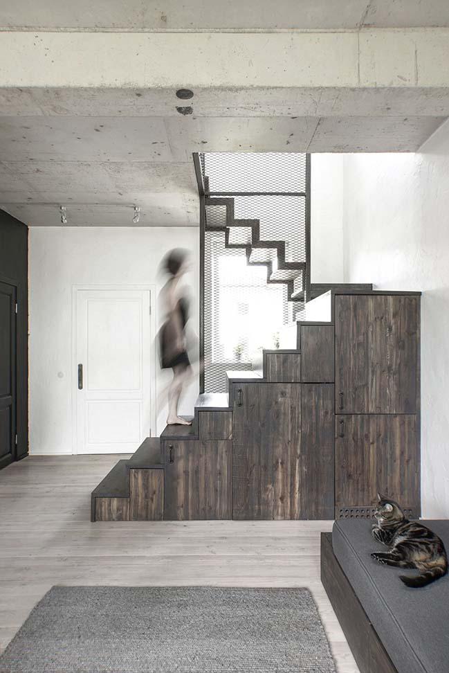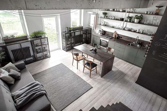 Los locales de este edificio estaban originalmente sin cableado ni instalaciones. Sólo paredes desnudas, hormigón, solados y tabiques interiores. Todo un trabajo de ingeniería que fue implementado por profesionales. Todo lo demás se hizo de forma independiente por parte de los dueños: enlucido y pintado de paredes, limpieza y barnizado del techo de hormigón, montaje del entresuelo, así como la fabricación de muebles, lámparas y toda la decoración.