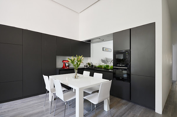 Ay Londres... ¡Qué ganas de volver! Tenemos la idea de hacer una escapada rondando por la cabeza desde hace unos meses y, para más obsesión, nos encontramos en pinterest con esta maravilla que nos ha dejado boquiabiertas.... En pleno corazón de la ciudad (concretamente en Nevern Square) se encuentra este piso de 69m2 que fue completamente reformado para albergar un hogar donde el leitmotiv es una ordenada y fluida secuencia lineal que permite el paso de la luz natural de una punta a otra de la vivienda. ¡Un rotundo acierto! Como veréis claramente en la secuencia de imágenes, el diseño principal son dos módulos en forma de " L" (uno en blanco y otro en negro) que separan el dormitorio del salón-comedor-cocina, diferenciando así zona de día y de noche. Ambos módulos dan cabida a varios armarios que en el caso del dormitorio son para ropa, etc, y en el caso del comedor-salón sirven para guardar el menaje de cocina, la despensa, el bar, etc. Pero su mayor acierto fue abrir una ventana en medio del tabique para comunicar visualmente las dos zonas, con lo que se pueden tener vistas de un lado a otro de la casa sin obstáculos. Pero también se pueden aislar, para dar privacidad al dormitorio, ya que colocaron en la parte de la cocina un persiana que cierra totalmente la vista. Este y mil detalles más, como aprovechar el desnivel del dormitorio para colocar almacenaje extra debajo de la cama, hacen de este proyecto una joya digna de ser estudiada. Un ejemplo perfecto del aprovechamiento de los espacios pequeños.