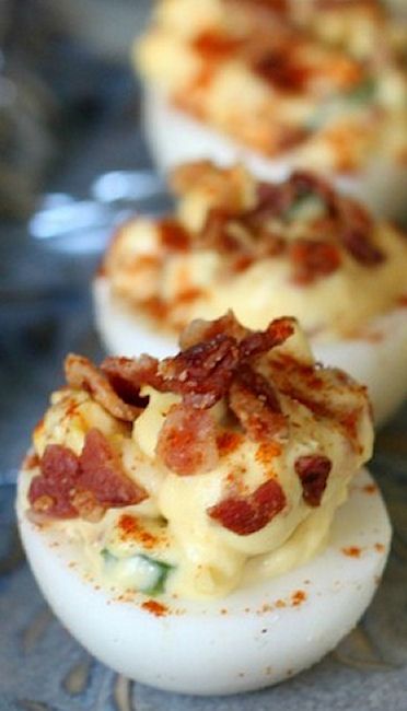 Huevos rellenos con cobertura de bacon crujiente