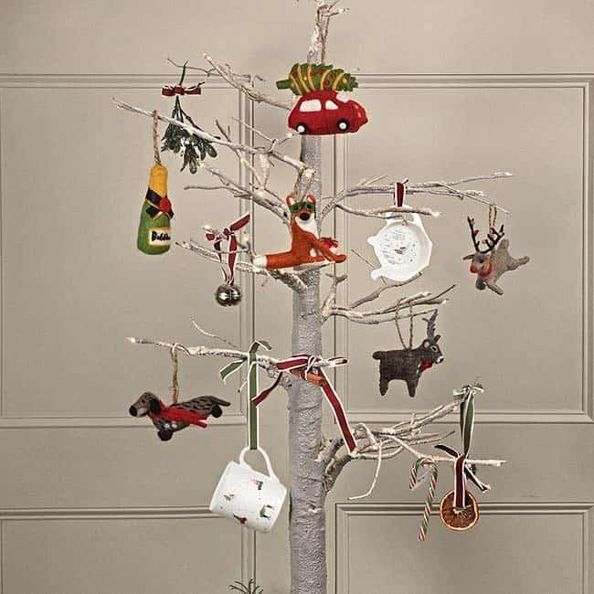 Fuente: Sophie Allport Buena alternativa al clásico abeto navideño es este árbol pelado, pero tan bonito y vistoso como si fuera el más frondoso. Está adornado con objetos divertidos de Sophie Allport Home, desde una jarrita a unos cascabeles. ¿Te gusta? Pues, toma nota para hacer el tuyo. Solo tienes que encontrar una rama bonita en el campo y pintarla con pintura dorada o plateada. Después cuelga de ella tus adornos preferidos. Este árbol será una de las ideas diferentes para decorar en Navidad y, sobre todo, reflejará tu estilo.
