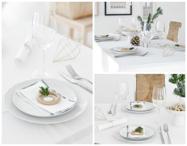 Empezamos por la mesa para Navidad que nos propone el blog Passion Shake. Una decoración delicada en la que un sencillo adorno con unas anillas de madera y metal dorada con un ramita de abeto se convierte en el eje central de la mesa. Alguna piña pintada en oro y adornos navideños en forma de diamante completan el conjunto. Personalmente me apasiona esta de Navidad, por su sencillez y buen gusto.