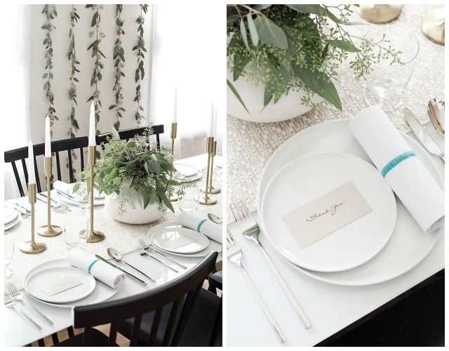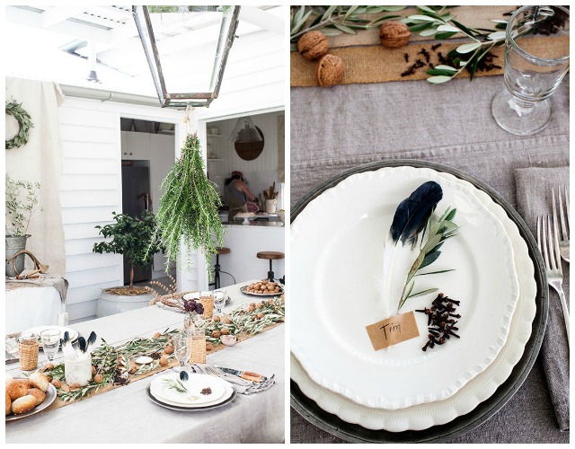 En la segunda propuesta para la mesa de Navidad homey oh my recurre a las hojas de eucalipto para crear unas guirnaldas en forma de cortina o el centro de mesa. Una mesa elegante que se completa con unos esbeltos candelabros en metal. Si os gusta esta idea no os podéis perder este post para decorar con eucalipto en Navidad.