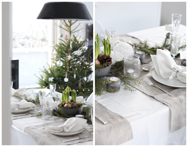 Esta luminosa decoración de mesa ya os la mostré el año pasado, pero no podía faltar en este recopilatorio de mesas de Navidad de estilo natural. Unos bulbos de jacinto sobre ramas de abeto en el centro de mesa, un mantel blanco de algodón y manteles individuales en lino en un tono mas oscuro, portavelas en cemento y tarros de cristal reciclado, son los elementos que necesitarás para recrear una mesa de estilo nórdico tan blanca, luminosa y natural como esta. Si queréis ver todas las imágenes en este post las encontrareis