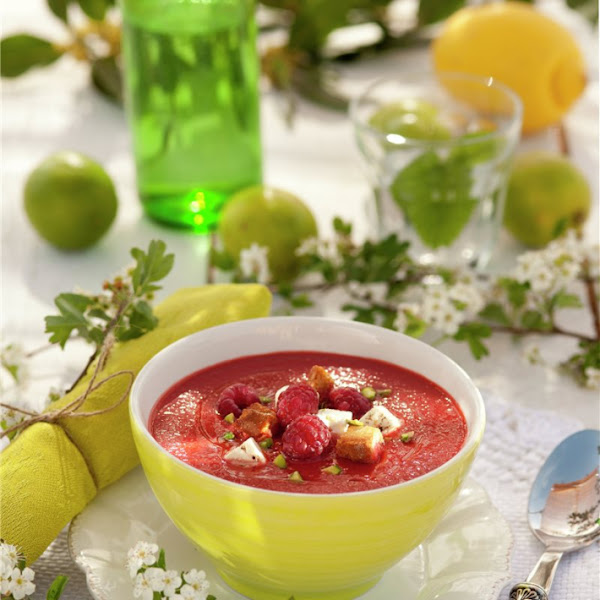 Esta variante de gazpacho es de un rojo intenso porque lleva tomate, pimiento rojo y frambuesa. Se acompaña con queso feta a cuadraditos, pistachos y frambuesas enteras por encima. Y os apetece la receta completa en el blog de Lecturas.