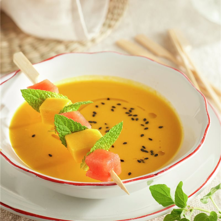 ¿Te atreves con un gazpacho de sabor más tropical? Este de Lecturas es de mango, pero con hortalizas propias del gazpacho tradicional. Además nos propone acompañarlo de una brocheta de sandía y trozos de mango.