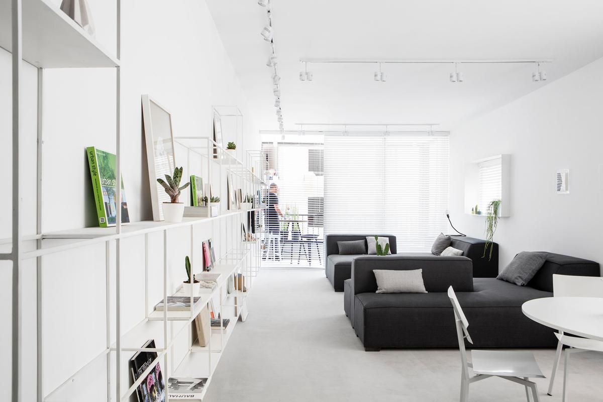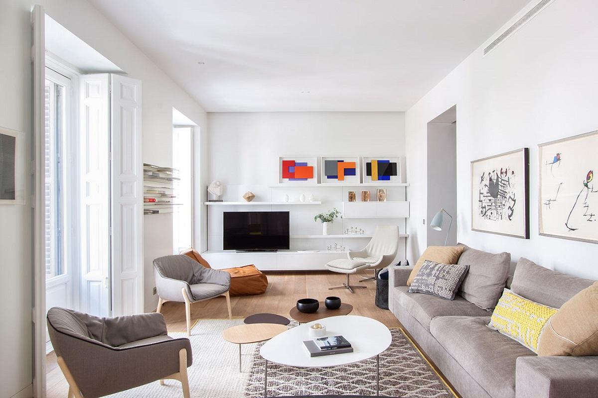 Apostar por estanterías o librerías de estilo minimalista con un diseño depurado y ligero es una de las soluciones decorativas para los pisos pequeños. No tienen por qué llegar de suelo a techo, cuanto más ligeras sean mayor sensación de amplitud visual se conseguirá. Se puede jugar con las alturas como esta librería de estructura metálica en color blanco que se mimetiza con la pared y con la decoración de la estancia.Muebles con formas redondeadas