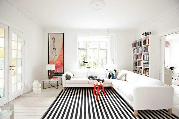 Otro buen consejo es este, utiliza líneas rectas para que las habitaciones parezcan más largas o anchas de lo que son en realidad. Es un buen truco que podremos poner en práctica de varias formas. Podemos pintar las paredes con líneas horizontales (siempre mejor solo una o dos que estén enfrentadas como mucho) intentando que el color no sea muy oscuro. Por ejemplo podríamos pintar una pared con unas líneas en blanco y otras en una tonalidad algo más oscura (blanco hueso o blanco arena) y usar de este recurso de una forma más sutil pero igual de efectiva. También podemos usar alfombras para poner en práctica esta opción. Aquí si podríamos elegir colores mas oscuros aunque sin pasarnos.