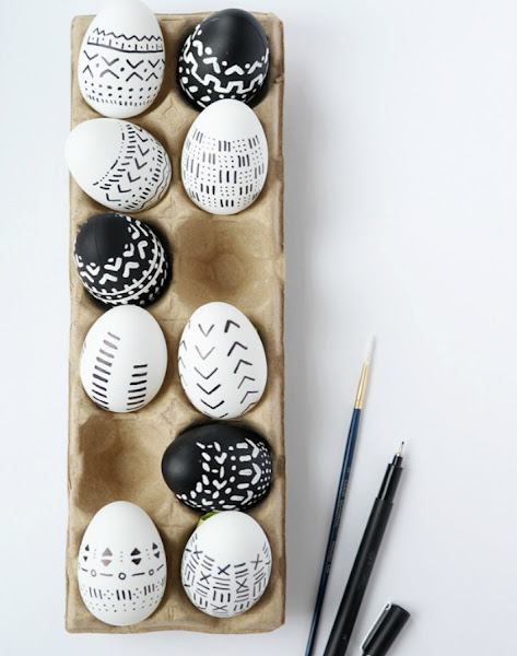Aunque los huevos se suelen decorar para Pascua, no me he podido resistir a incluir este diy. Lo bueno de este tipo de dibujos es que no necesitas que queden perfectos, es la magaa del estampado mud cloth que se note que son artesanales. La idea es de Alice and Lois
