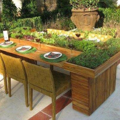 La mayoría de las veces cuando pensamos en una mesa de palet pensamos en las mesas de centro pero es un mundo lleno de posibilidadas que para los más atrevidos y/o manitas pueden convertir los tableros de un palet en otro tipo de mesas como por ejemplo esta mesa alta a modo de barra que incluye un mini jardín. Preciosa idea ¿No crees?