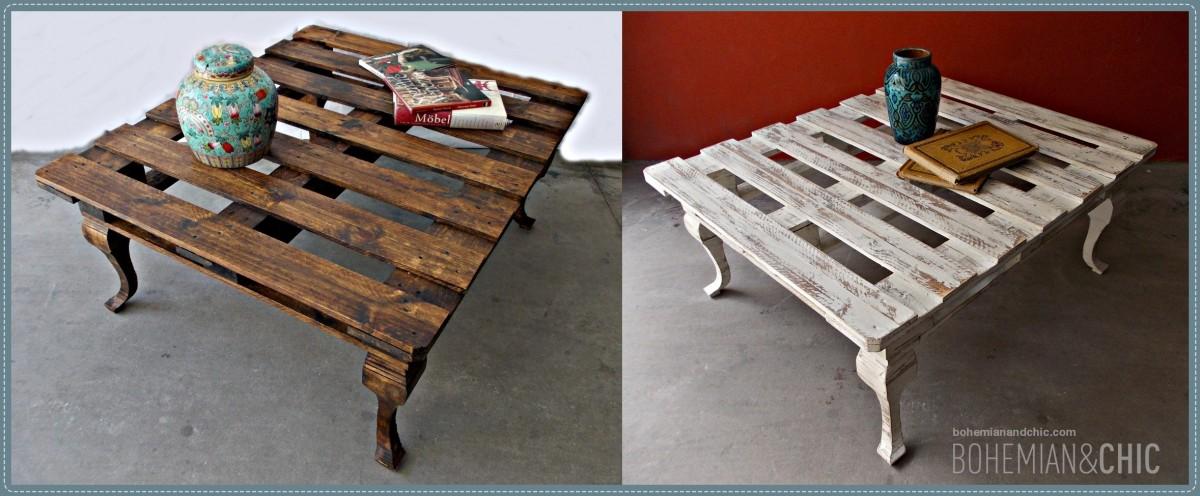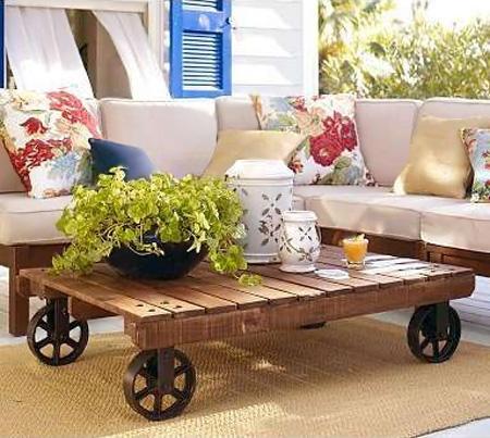 Las mesas de este tipo se pueden componer de solo un palet o podemos incorporales patas o ruedas que le da un toque industrial como se ve en esta aquí.
