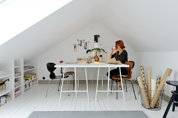 ¿Qué os voy a contar de este estudio? Las imágenes lo dicen todo por si mismas. Yo quiero uno así para mí. Gran zona de trabajo y luz natural asegurada durante todo el día. gracias al gran tragaluz. Impresionante, cualquiera tiene ganas de trabajar si cuenta con un despacho como éste. Y vosotros, ¿tenéis una zona de trabajo en casa? Si queréis ver la mía, sumida en el caos como casi siempre, os dejo un enlace a un post que hice sobre zonas de trabajo en casa.
