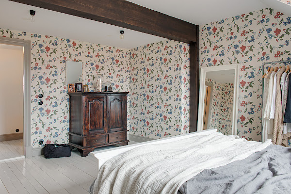 Esta amplia habitación destaca por el papel pintado de flores, aporta un estilo vintage a la estancia con la ayuda del resto de complementos.