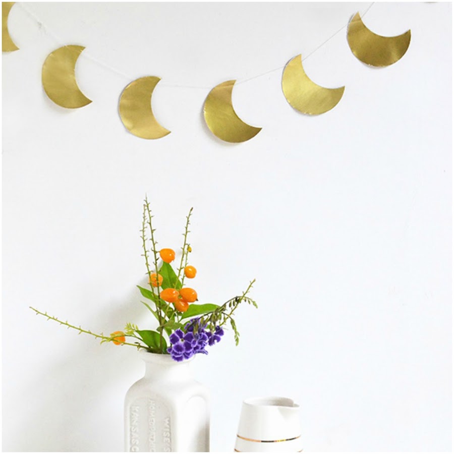 En el mismo blog que la idea anterior Tell and Me, encontramos esta guirnalda de lunas doradas. Todo lo que necesitas es una perforadora, cuerda y papel dorado.