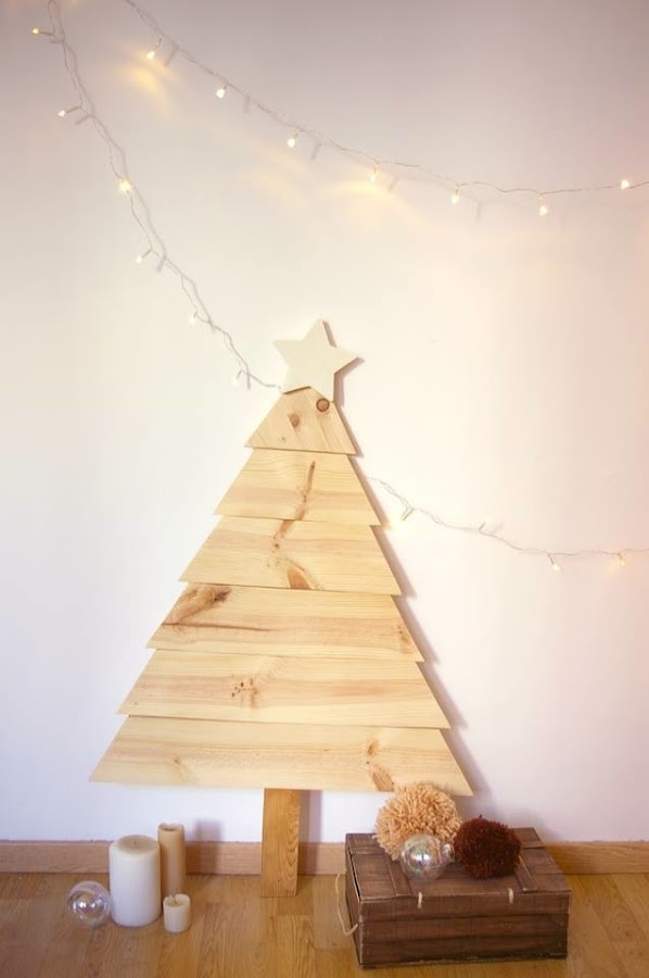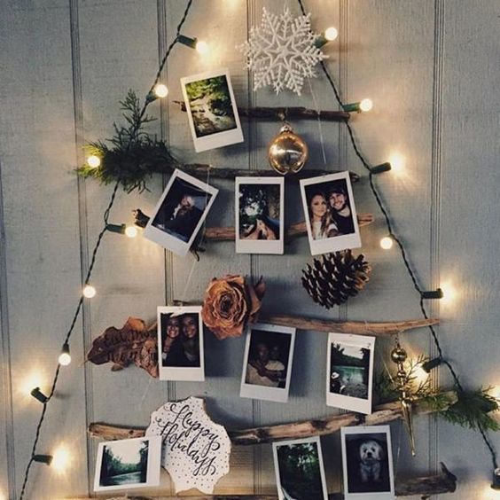 Lo que tenemos que tener claro si no disponemos de mucho espacio es que el nuestro tiene que ser distinto, tenemos que abrir horizontes y dejar volar nuestra imaginación. Para empezar nos tenemos que olvidar del concepto de árbol tradicional y hacer otro tipo de apuestas como las que vemos en las imágenes. Podemos elegir ramas, fotografías, ramitas de pino, luces, pintarlo en la pared, usar cuerda, elegir uno de hecho de tablas... o incluso hacerlo con washi tape. Así que solo tenemos que elegir la que mas nos guste o tirar de imaginación y hacer un distinto a los que os muestro hoy.