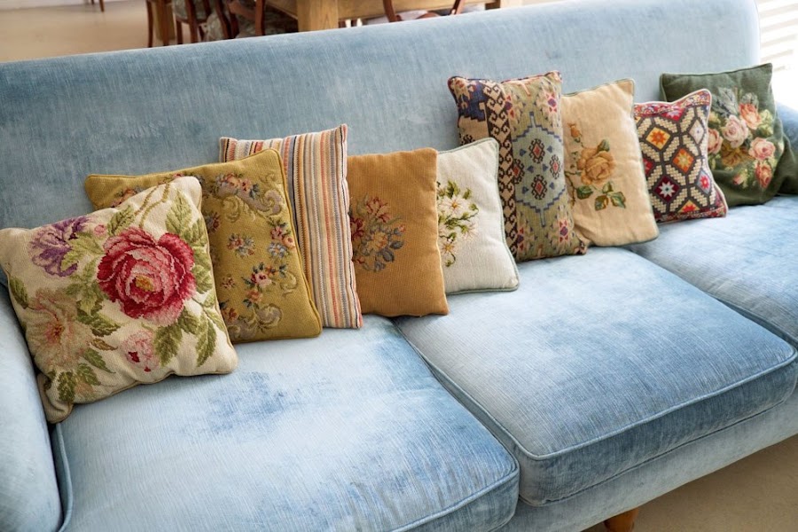 No somos de trabajos de aguja fina o de punto y ganchillo. Una de nosotras lleva intentando terminar una colcha de crochet ¡añossss!, lo mismo que un "petit point" de un paisaje escondido en una caja, que a saber donde estará la caja... Cuando vemos las manos que tienen algunas compañeras blogueras confeccionando colchas, cuadros de punto de cruz, mantelerías... Verdaderos primores que alabamos con el entusiasmo de la envidia sana, y el convencimiento de que nunca llegarán a nuestras vidas ni a nuestros hogares, si depende de estas manitas y de nuestra paciencia y habilidad. Dadnos una brocha y un bote de pintura, una martillo o una lijadora... ¡Esa es la marcha que a nosotras nos va! Aunque se nos vayan los ojos como locos detrás de un buen bordado y si es para decorar, mejor que mejor, y si es en forma de cojín, ¡amor total! Los consideramos, a pesar de sus dibujos y motivos casi siempre clásicos, un elemento atemporal que casa bien con cualquier estilo decorativo. Además de aportar al entorno el valor indiscutible de su factura manual y artesanal.