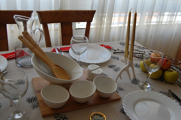 También he elegido una vajilla en color blanco, sencilla y sin adornos como suelen tener las vajillas que tenemos para las ocasiones, porque entonces se vería muy recargado junto con el mantel. Ten en cuenta esto.