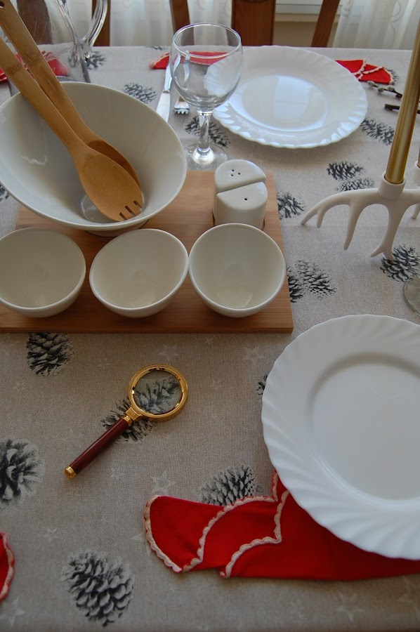 Este año me he decantado por un mantel color lino con motivos de piñas en tonos grisáceos y estrellas blanquecinas muy discretas. Como puedes ver, aunque son colores muy neutros, tiene bastante detalle, entonces el resto de objetos que colocaremos encima serán sencillos, pero bueno, no te voy a adelantar nada...