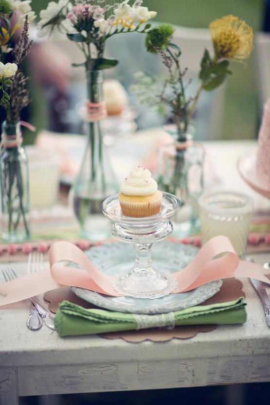 Cintas, encajes, botellas antiguas con flores, colores pastel, velas.
