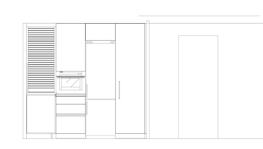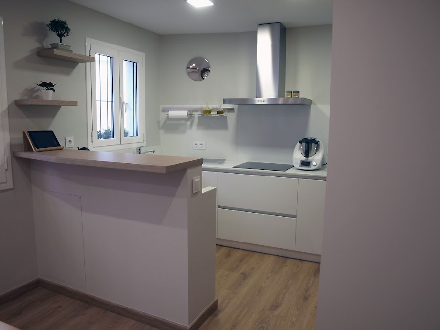 La península con módulos a medida hará la función de barra sin perder capacidad. Esta barra la realizamos con mayor altura que el mueble interior, para poder ocultar a la vista los elementos varios de una cocina. También aprovechamos el rincón interior ciego, con un acceso por el exterior, instalando una puerta con bisagra oculta.