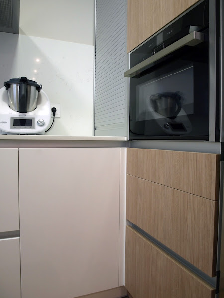 La necesidad de ganar amplitud y capacidad nos llevó a contemplar la posibilidad de tener un espacio único cocina-comedor, cada vez más presente en los hogares.Se realizó una distribución en U, con zona de columnas y el resto módulos bajos. No se colocaron módulos altos para no recargar el espacio, únicamente unas baldas decorativas a conjunto de las columnas.