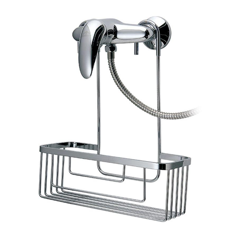 Práctica jabonera que se coloca sobre el grifo de ducha. no necesita ningún tipo de instalación. Está fabricada en latón cromado. Largo: 300 mm, alto 370 mm, fondo 120 mm.
