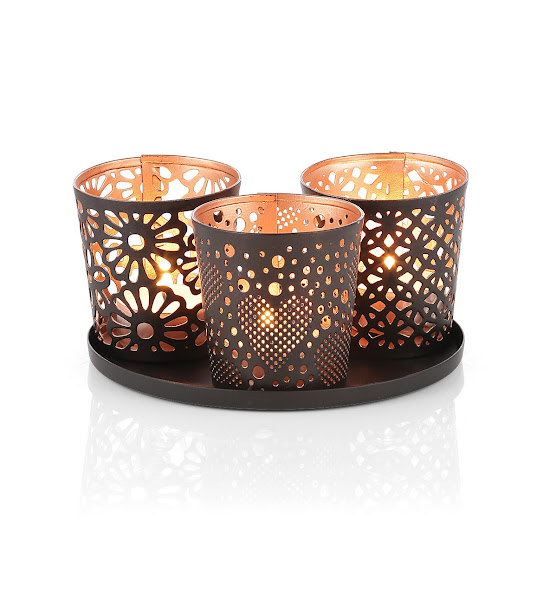 El primero está compuesto de un set de tres portavelas sobre una bandeja de metal, son decorativos sin encender, pero con las luces de las velas son aún más espectaculares porque crean un efecto de luz muy original gracias a su troquelado.