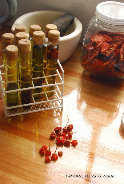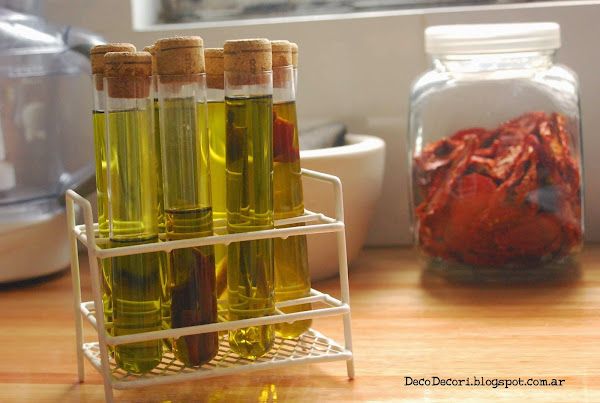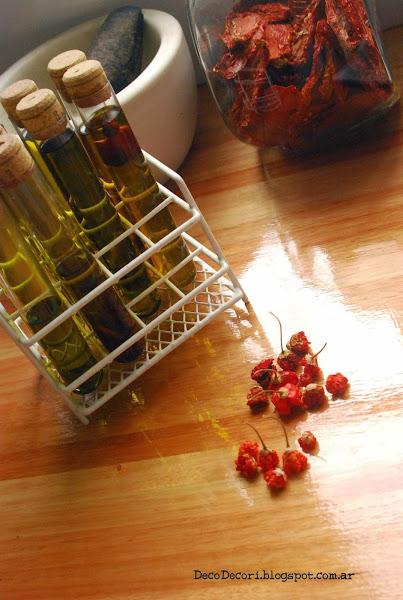 Hace varios años descubrimos que está buenísimo tener frascos con aceite de oliva extra virgen con diferentes sabores. Por mencionar algunos: