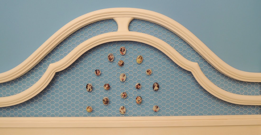 Para terminar, no queríamos olvidarnos de este cabecero que redecoramos con malla de gallinero. Un soporte perfecto para personalizarlo, como con estos pequeños camafeos.