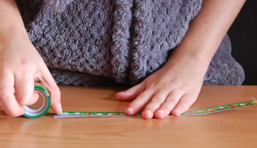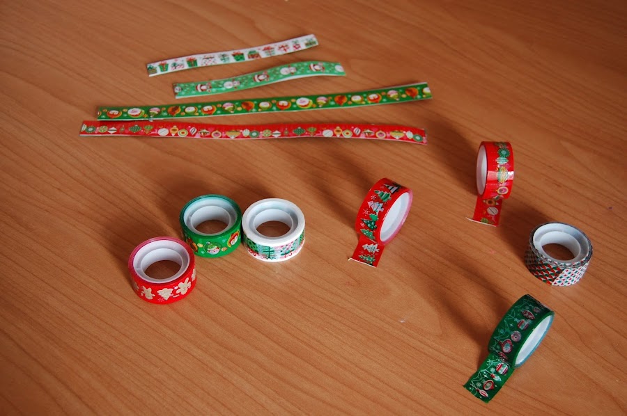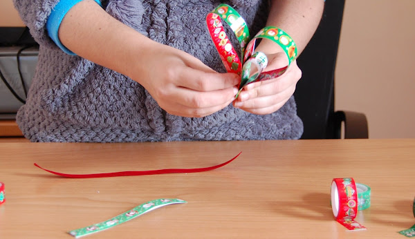 Para hacer un adorno necesitas 2 tiras grandes y 2 tiras pequeñas. Cubrimos con Washi Tape toda la tira por ambos lados y corta el sobrante.