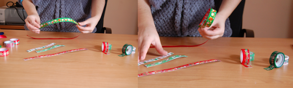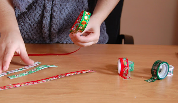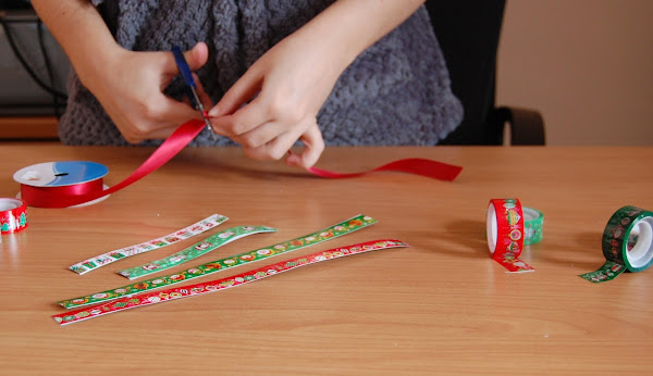Corta unos 24 cm de lazo. Yo he elegido el color rojo para que se mimetice con los colores de los motivos navideños del Washi Tape. Resérvalo y atención al siguiente paso.