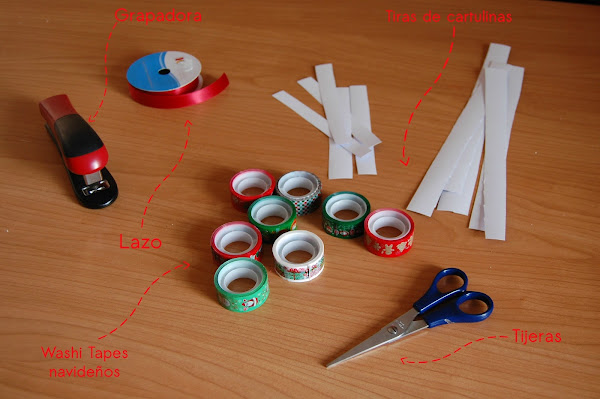Sólo necesitas cartulinas cortadas en tiras unas de unos 24 cm de larga y otras de unos 15 cm. Para el ancho calcula más o menos el ancho de tu Washi Tape, pero no te preocupes si te sobra cartulina cuando lo pegues, lo cortas y listo. El objetivo es cubrir completamentela cartulina por ambos lados.