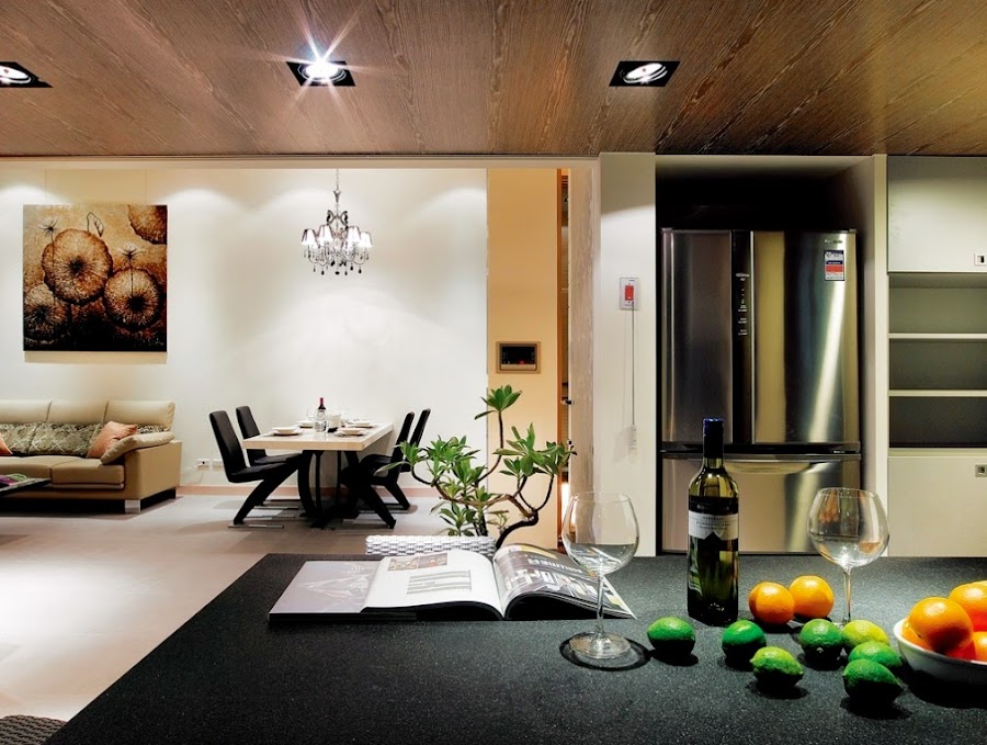 A lo largo de la zona, las luces de techo empotradas brillantes derraman su brillo en toda su extensión, y su forma de cuadrados recoge en los azulejos una función de diamantes negros salpicados en el suelo.