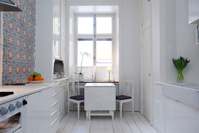 Al fondo y cercana a la ventana, una mesa abatible para dos comensales... la luz entra a través de la celosía... el espacio perfecto para desayunar!