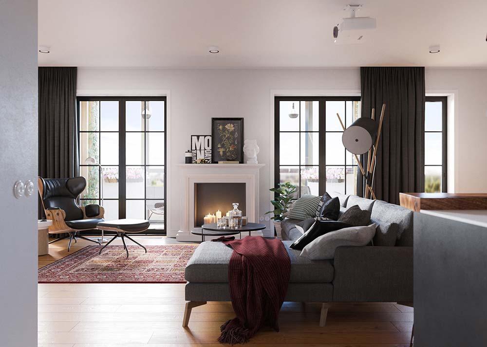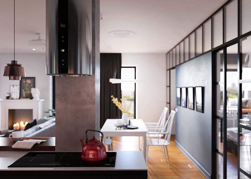-La pared divisoria con las puertas correderas de cristal que combinan con la imagen general.