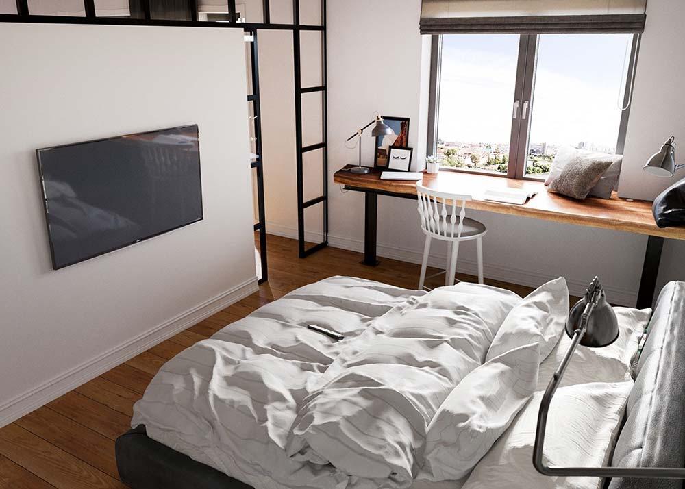 La solución de pared semitransparente que divide el salón del dormitorio es perfecta. Un toque de buen diseño y sobre todo de originalidad que marca todo el espacio.