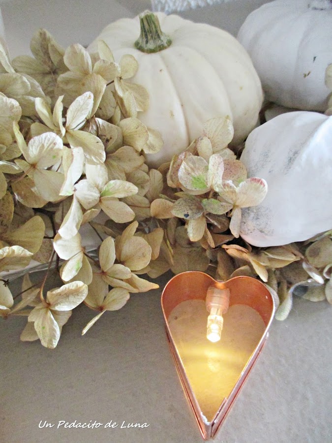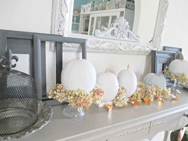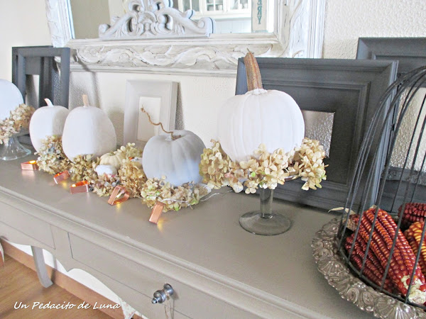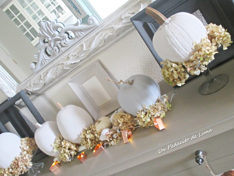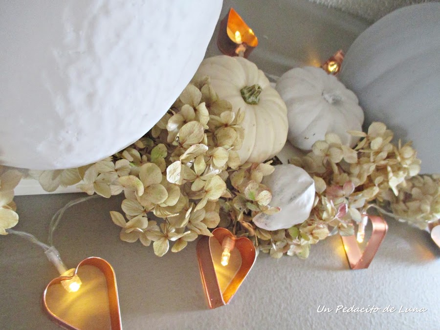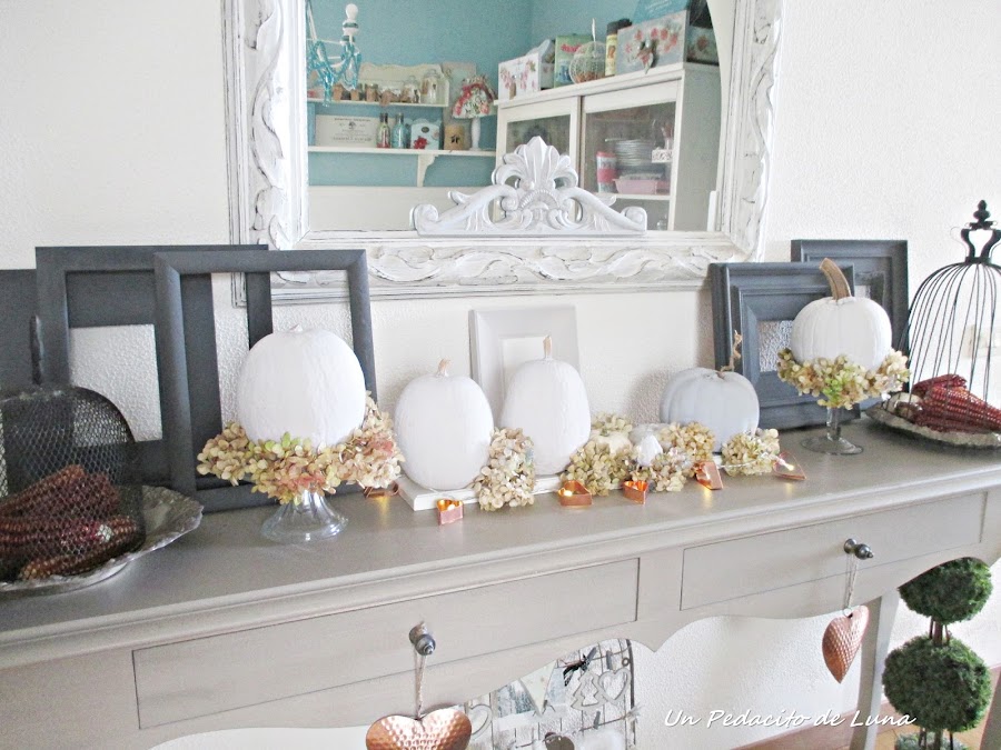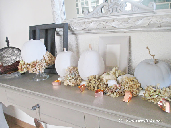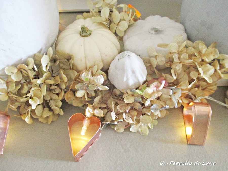 Compuesta ya la escena, sólo quedaba colocar mis calabazas dispuestas unas sobre una tablilla, y otras en dos tamaños diferentes de stands para tartas que conseguían darles altura, así como adornadas con flores secas de hydrangeas.