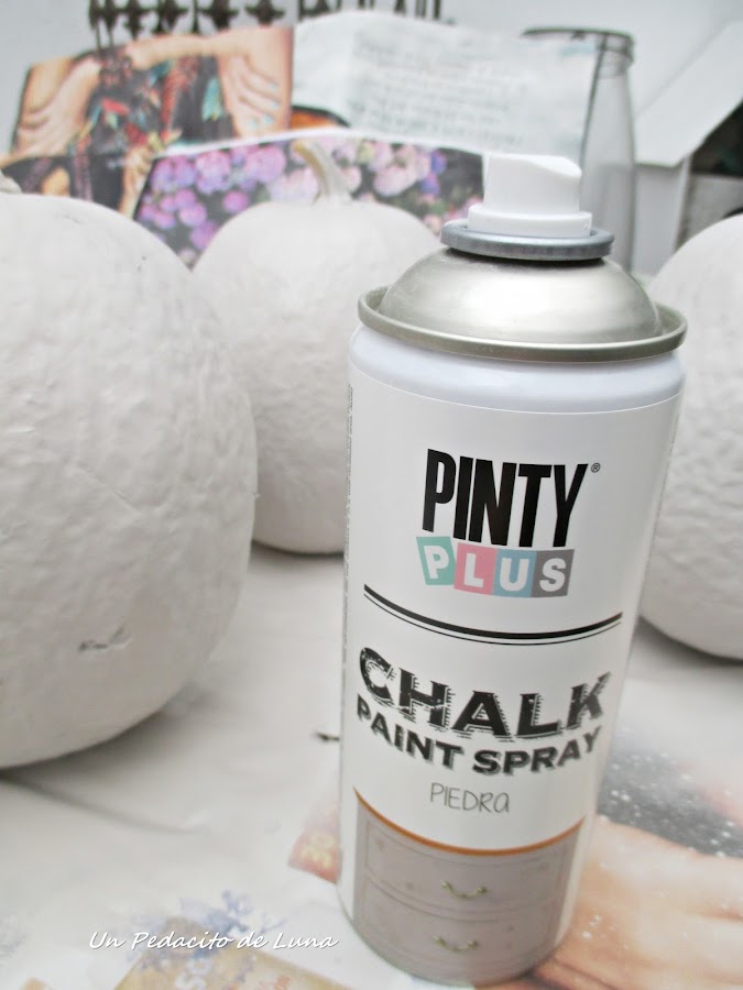 Juntando las chiquitinas con varias calabazas más que ya tenía (una del pasado otoño que aún sigue viva), las rocié con pintura chalk en spray tono piedra.