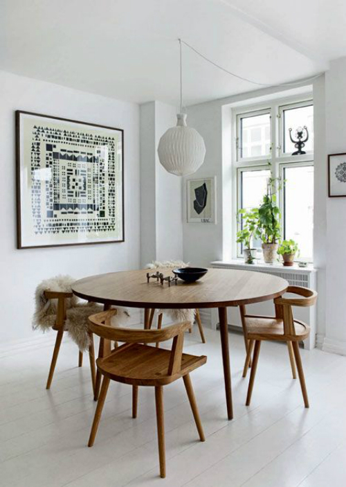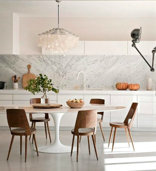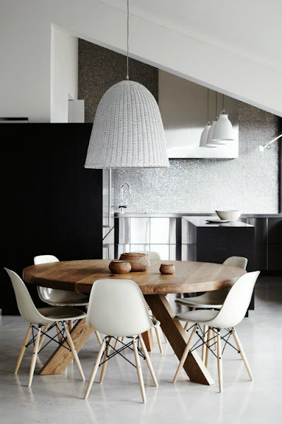 El punto flaco es muchas veces el número de comensales que caben en este tipo de mesas que suele ser más reducido que en una mesa rectangular. Aunque ahora muchas de estas mesas son extensibles, como la de la primera foto. Mi preferida siempre ha sido la mesa Tulip en sus diferentes versiones, pero creo que por el momento me tendré que conformar con las rectangulares que se adecuan más a mi espacio. En cuanto a las de madera me parecen espectaculares pero yo siempre las acompañaría de sillas transparentes o de rejilla, visualmente más ligeras, como en la foto , para que se vea la mesa y no le quiten protagonismo las sillas
