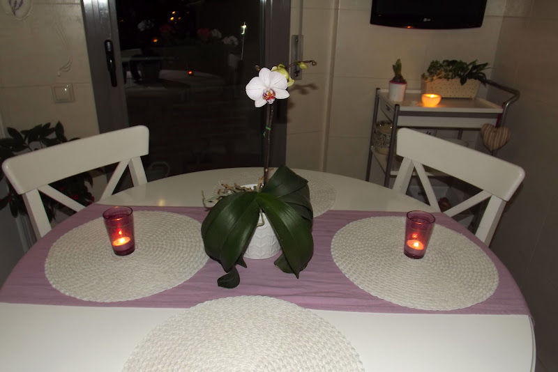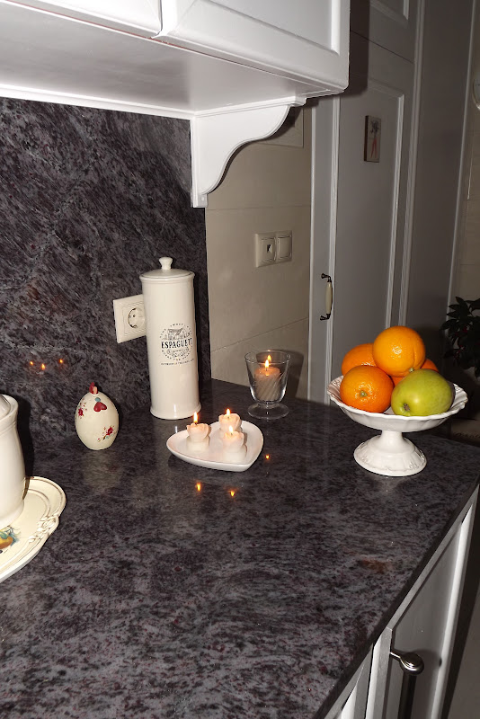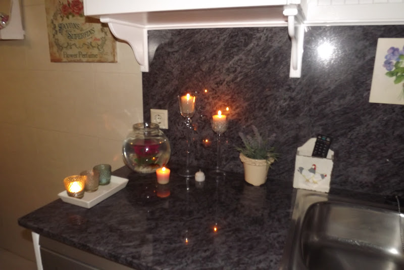 Hoy me siento un tanto nostálgica será por la fina lluvia que no ha cesado de caer en todo el día...por eso al llegar la noche he encendido velas por toda la cocina,me encanta,le da un cierto aire misterioso y mágico que invita a una cena relajada y en familia...
