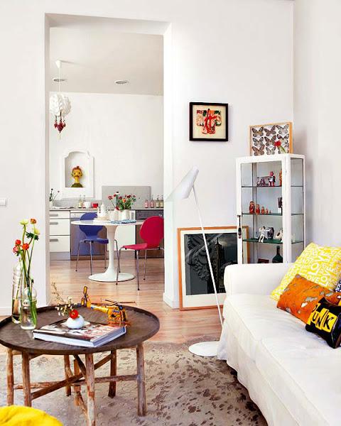 Este apartamento ecléctico tan luminoso de paredes blancas pero con millones de objetos de distinta procedencia, estilo y color, se encuentra ubicado en Madrid y es el segundo hogar de una pareja que vive la mayor parte del tiempo en Nueva York.