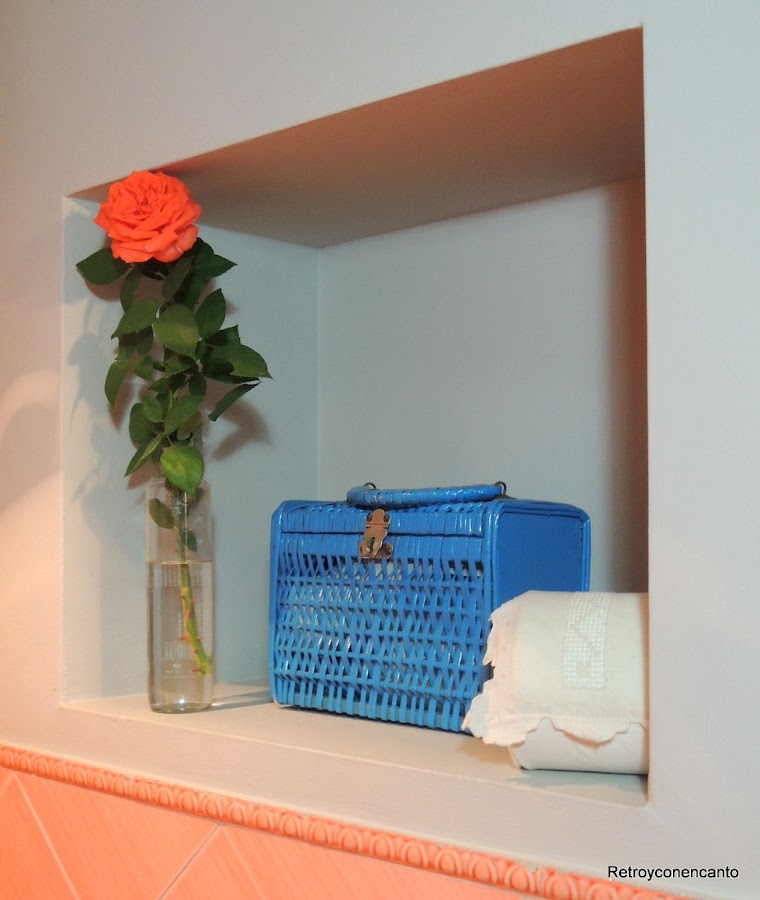 Os mostramos nuestra hornacina, situada en el cuarto de baño del taller. En esa cestita azul guardamos "asuntos femeninos", y una coqueta funda para el papel cular... Ya os vemos a más de un@ con un pico haciendo un huequito en la pared para decorarlo con gusto ¿a que sí?