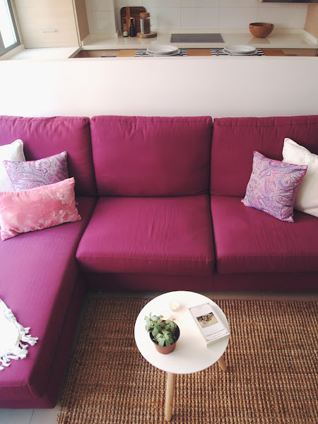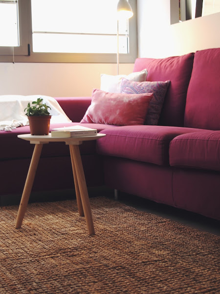 TERCER PASO: Había que ser REALISTA, con lo marcado del color de mi sillón, que es el auténtico protagonista, los cojines de colores que son imprescindibles para mi y los diferentes ambientes y usos para un espacio NO tan amplio, sabía que lo mejor sería escoger una alfombra que aportara mucha calidez pero sin más mezclas de colores, asi que decidí centrarme en la búsqueda de una alfombra de FIBRAS NATURALES).........