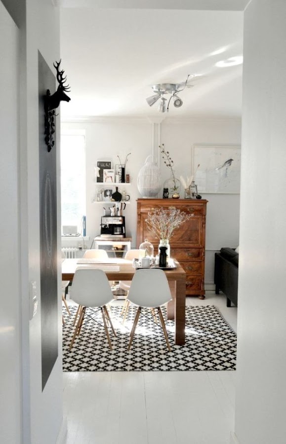 Para el caso de la zona del comedor, la manera correcta es que la alfombra ocupe hasta un espacio en que, cuando retiremos una silla para levantarnos, sigamos estando dentro de la alfombra. Debemos contar con 1.50 metros más para sus 4 lados. Aprovecha esta ocasión para elegir una alfombra cuyos detalles por el borde sean más llamativos que el centro, ya que realmente es lo que vamos a apreciar mejor.