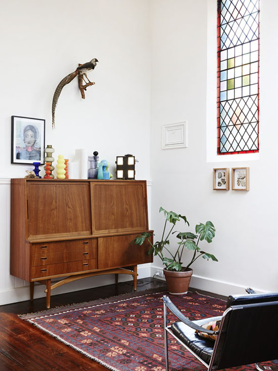 Mezcla la alfombra con muebles vintage y de madera para reforzar la rusticidad del espacio.