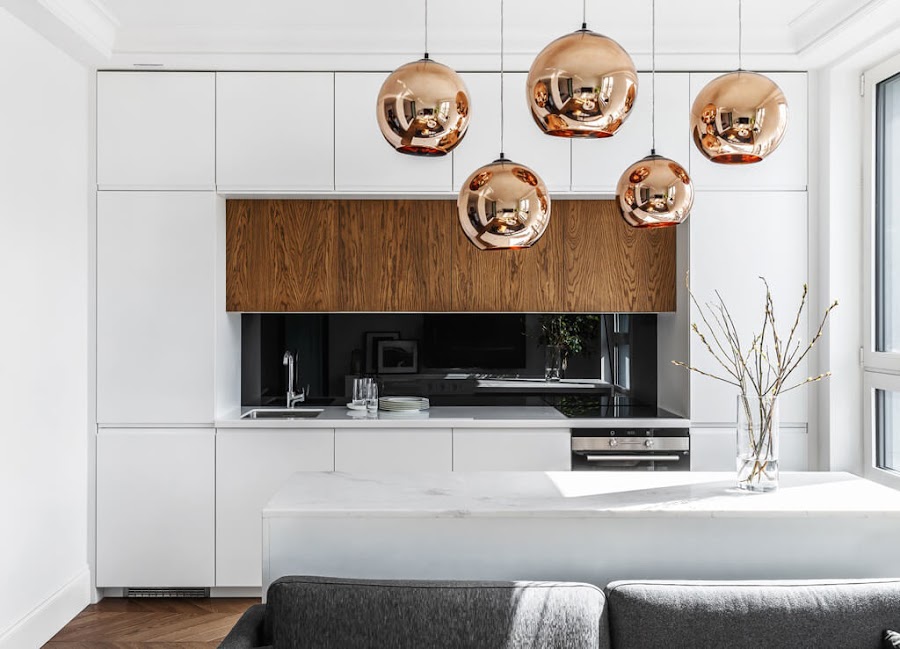 Un modelo sin tirador, con la encimera de mármol blanco, detalles en madera en forma de espina de pescado en la parte interior de la barra, al igual que el suelo y las 5 lámparas colgantes, que evitan un ambiente monocromático.