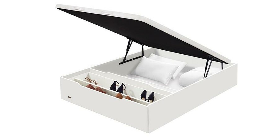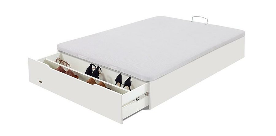 Canapés con zapatero: la gran ventaja de este tipo de canapés es que combinan las bondades de los dos anteriores. Por un lado, tiene una tapa abatible que da paso a toda la capacidad del canapé y, por otra, un cajón frontal extraíble adaptado como zapatero, con un fondo de hasta 42 cm. Así, a la hora de escoger dónde poner la cama en el dormitorio, es importante tener en cuenta el espacio hasta la pared, de forma que quede suficiente para poder extraer el cajón completo.