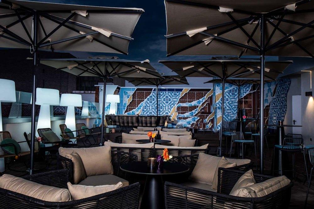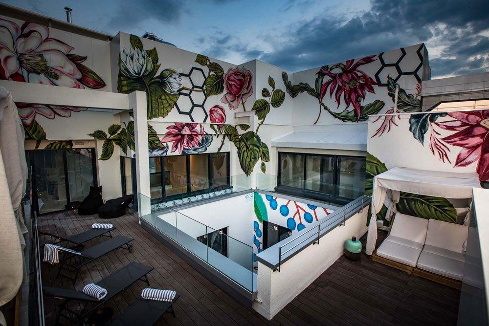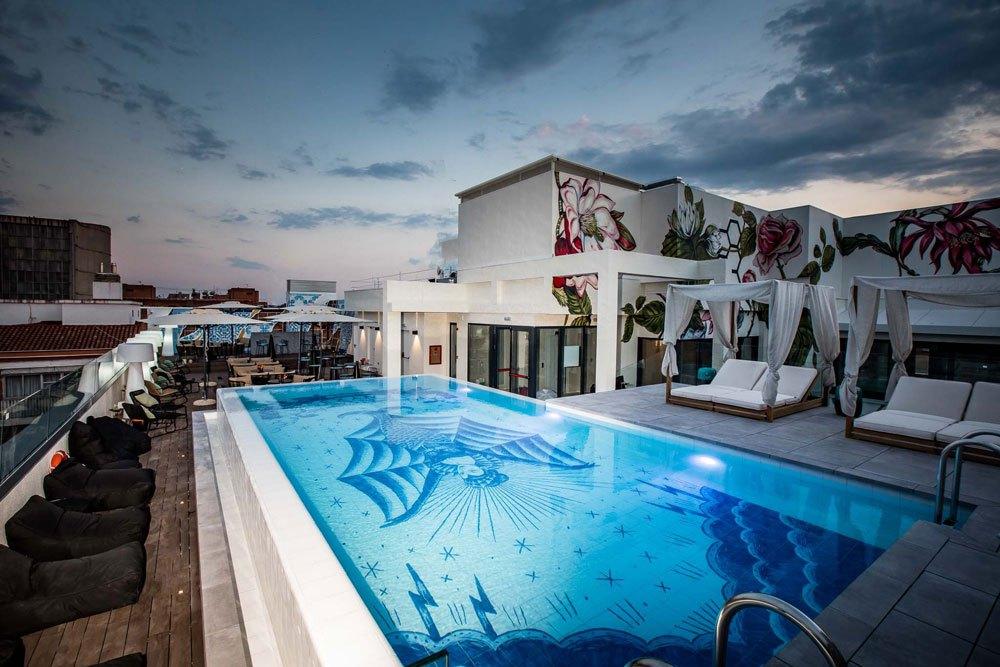 Zona de la piscina en la cubierta del hotel, con obra de SERGIO MORA Da gusto esta combinación. ¿Te animas?