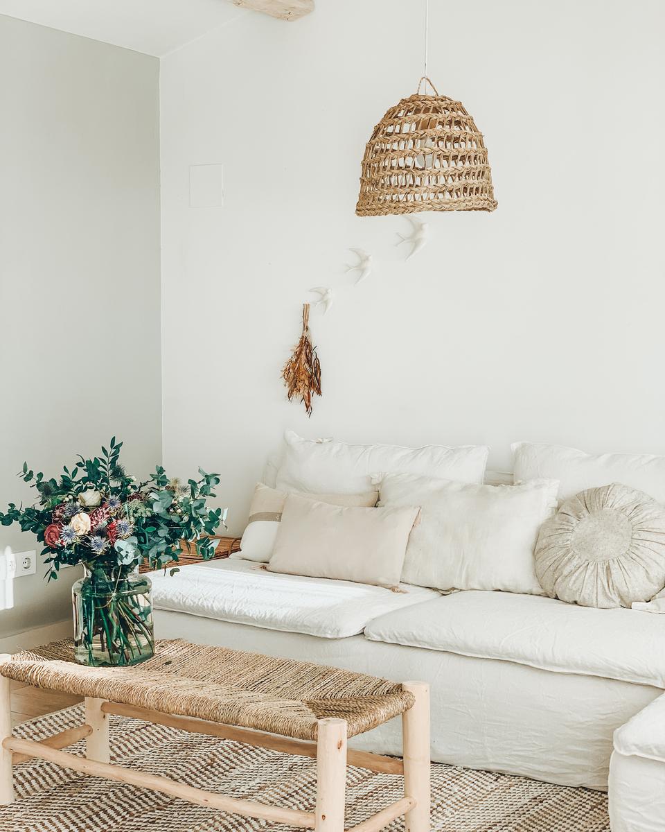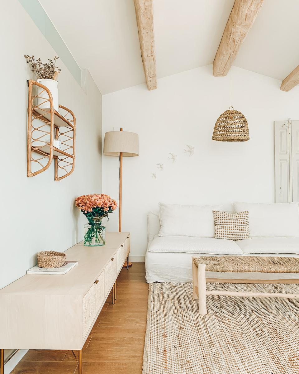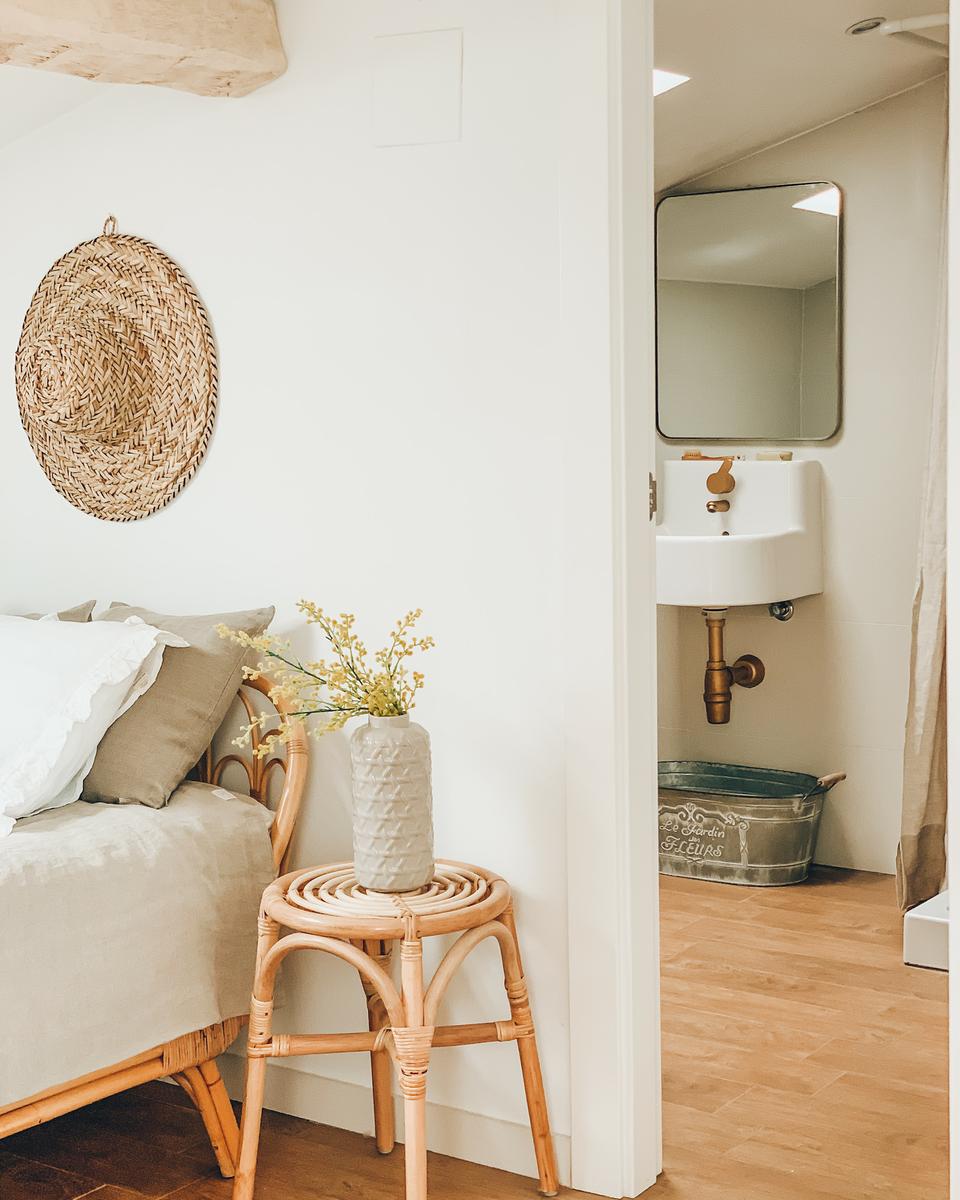 Para los que seáis nuevos por aquí, contaros que se trata de un espacio diáfano y polivalente de unos 45 m2 y terraza de 24 m2, totalmente independiente de la vivienda principal. Se ha buscado crear un ambiente relajado para su decoración, con elementos de aire rústico y mediterráneo en tonos neutros. Predominan la madera y otros materiales naturales como el lino, el yute o el ratán.
