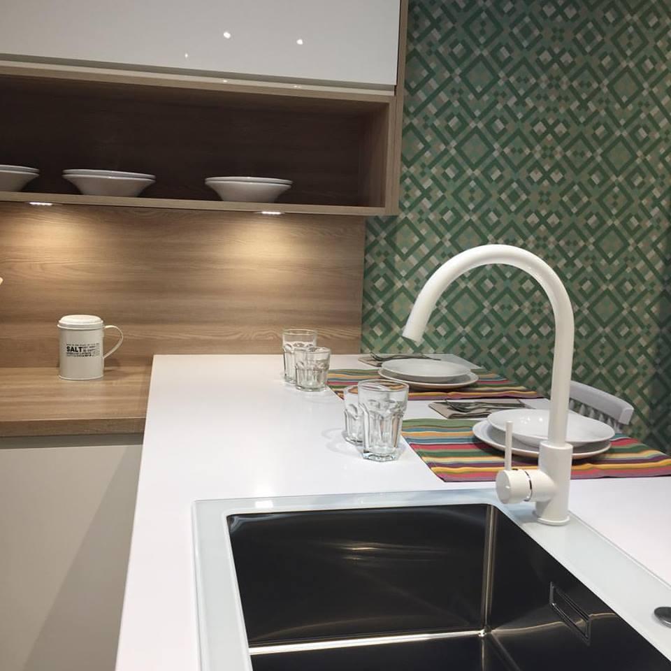 La nota de color la dimos con el wallpaper de Envés consiguiendo que la cocina número 2 de Alvic Center Granada tuviera su propia personalidad. ¡Me encanta!
