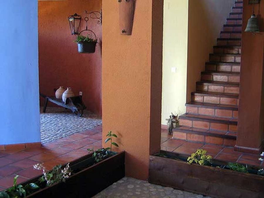Una vez llegados a la recepción, enseguida nos percatamos del gusto por los detalles rústicos: típicas baldosas de cerámica oscura, apliques realizados con tejas, farolillos de hierro, cántaros de barro... El objeto decorativo estrella es una fuente colocada donde convergen salón y comedor. El ruido relajante del agua promete una estancia agradable.